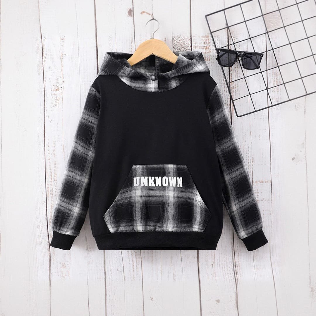 • Stylish Design: Solid black front with checkered sleeves and hood for a trendy look.